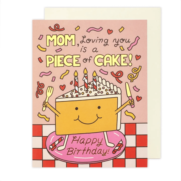 Greeting: “Mom Loving You is a Piece of Cake. Happy Birthday” (Blank Inside)