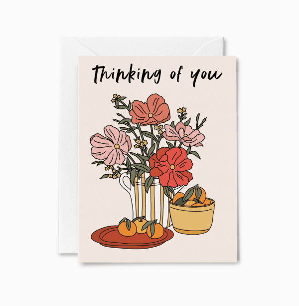 Sending warm thoughts with this ‘Thinking of you’ greeting card! Adorned with an exquisite illustration of flowers in a vase, accompanied by a bowl and plate of fruit, this card conveys your sentiments with elegance. Let someone know you’re thinking of them with this heartfelt creation. • Size: A2 (4.25 x 5.5 inch) • Comes with matching envelope • Printed in the USA on 110 lb recycled card stock • Blank inside