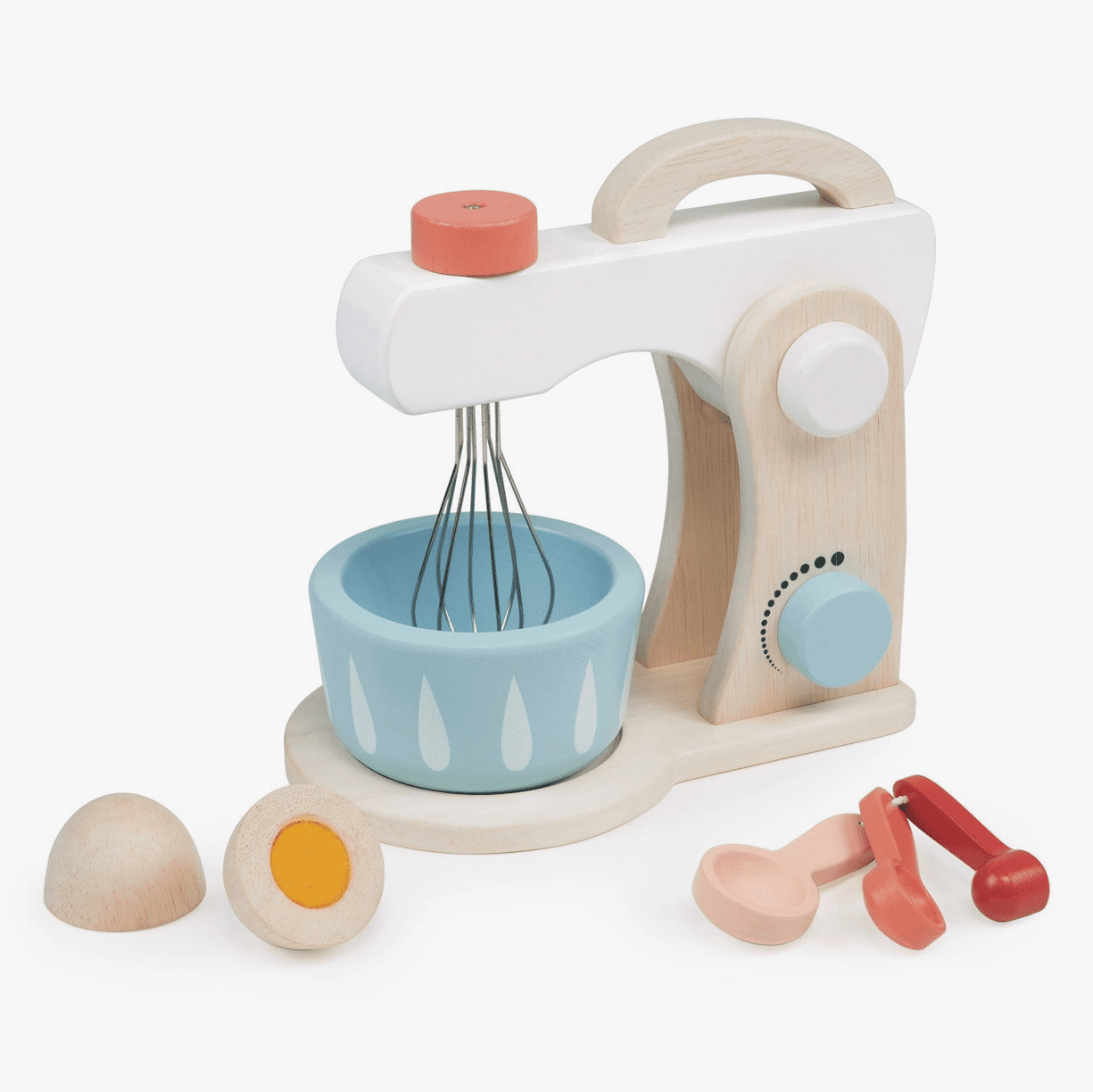 This wooden cake mixing toy comes with a blue bowl, a metal whisk that turns with a top button. There is a clacking button to select speed, and the arm with the whisk can be lifted to remove the bowl. Also included is a 2-part egg, and 3 measuring spoons. Age range: 3 years+ Product size: 6.89 x 4.33 x 7.09’’