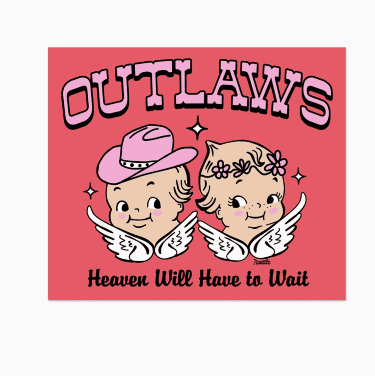 These lil outlaws are on their way to cause a ruckus. Retro inspired sticker, featuring hand drawn graphics. Perfect for a laptop, tumbler, car window, or other rad surface. Vinyl, rectangle sticker. Weather resistant and durable. Measures extra large at 5″ by 4.25″.